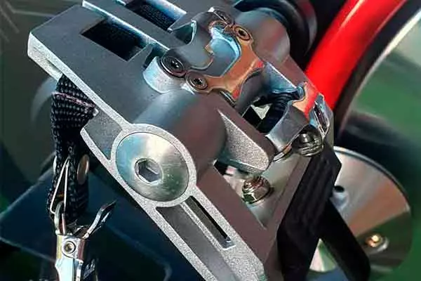 Calapies integrado en el pedal. Curvatura del pedal que coincide con la curva del calzado para eliminar los puntos de presión en el pié. Rodamiento y eje del pedal más fuerte y flexible forjado en acero y tratado térmicamente para una mayor resistencia.
