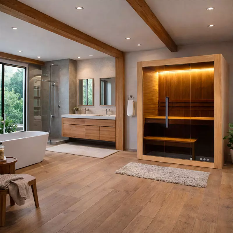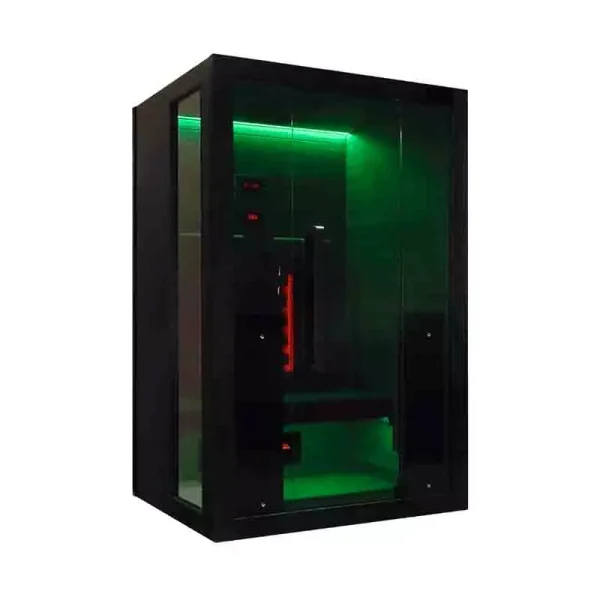 La sauna de infrarrojos 130 ofrece un espacio confortable para sesiones de bienestar en pareja o de uso individual con mayor amplitud. Su estructura está fabricada con madera termo aspen de 48 mm, lo que garantiza resistencia, estabilidad y una mejor conservación del calor. El exterior chapado en negro aporta un estilo elegante y moderno, perfecto para hogares, zonas wellness privadas, alojamientos turísticos o spas de pequeño formato.