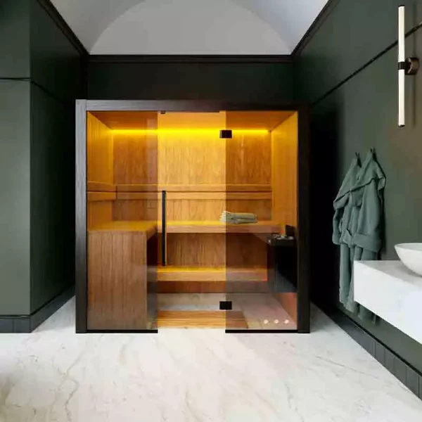 La sauna seca tradicional 210 ofrece un espacio amplio y elegante para 4 personas, con estructura de álamo termo, iluminación LED de cromoterapia y un potente calentador Harvia de 6 kW. Una solución de bienestar premium para hogares e instalaciones profesionales.