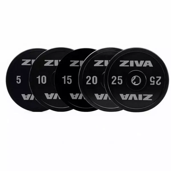 • Discos olímpicos de acero recubiertos por una capa de goma negra.